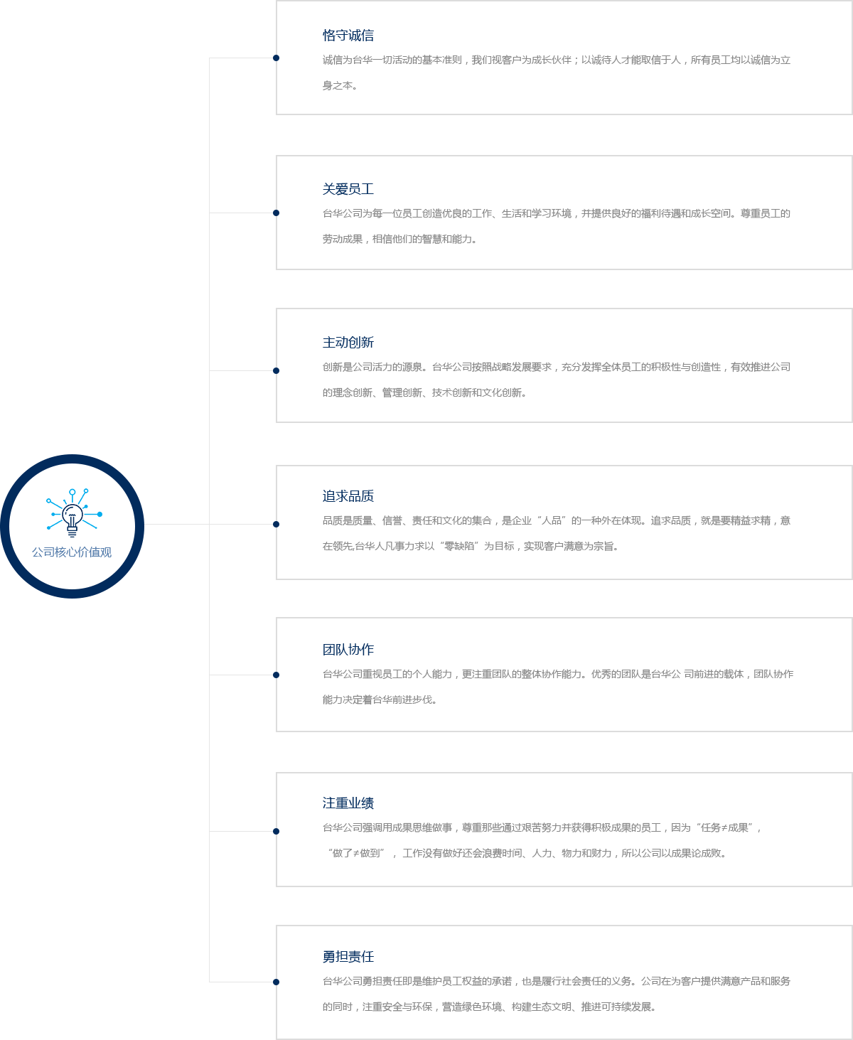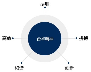 自2001年發(fā)展至今,臺華公司從小到大、從弱到強,臺華人用辛勞的汗水曾澆灌出了“主動、責任、紀律、團結”的精 神之花。2014年,為了適應公司新的發(fā)展要求,臺華人提出了新企業(yè)精神“盡職、高效、拼搏、和諧、創(chuàng)新”,并編入公司管 理制度及相關規(guī)范性文件。