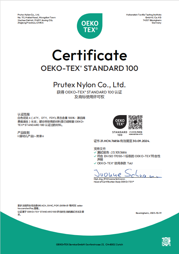 嘉華尼龍 2023年再生產(chǎn)品Oeko-Tex Standard 100證書(shū)