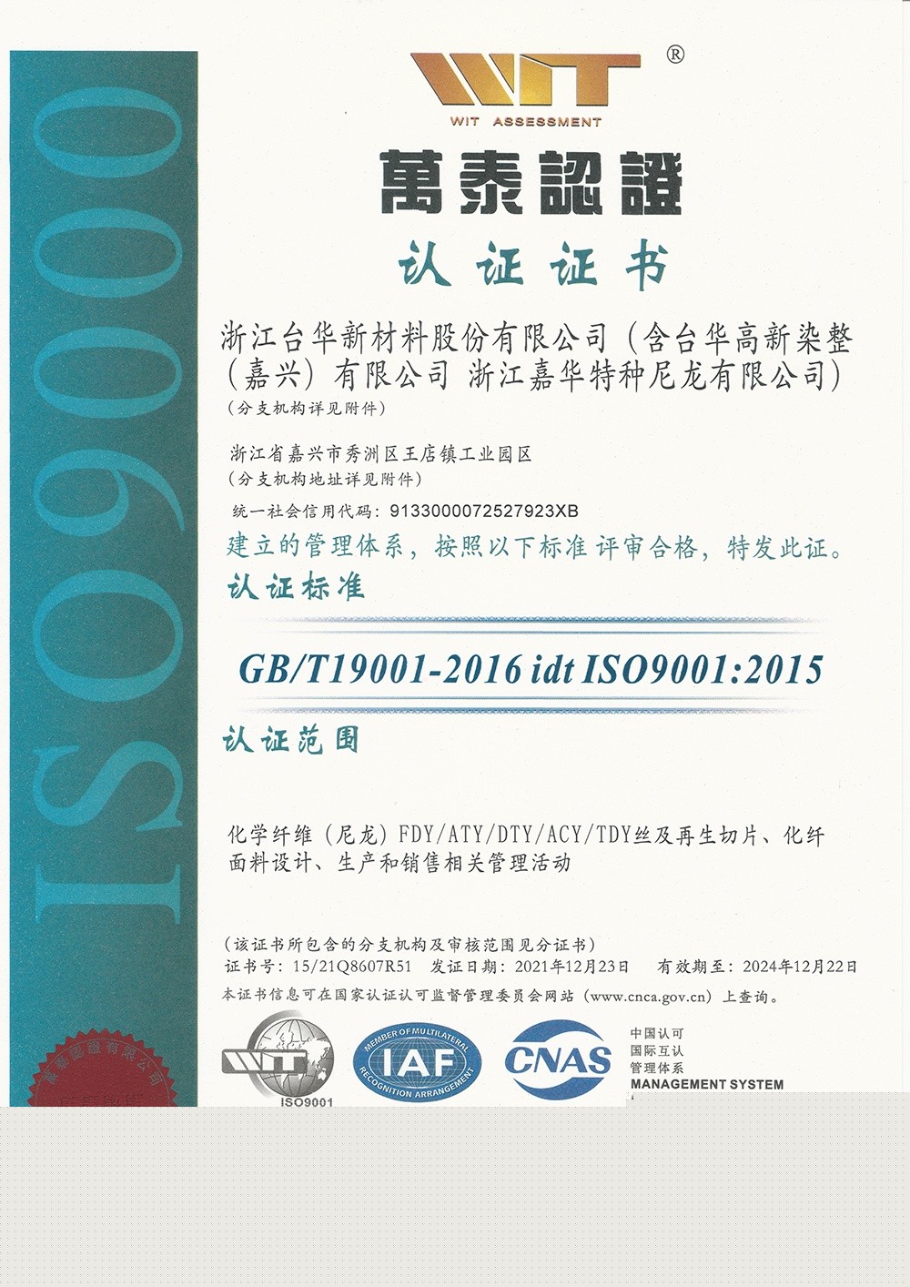 臺(tái)華新材(江蘇)ISO9001