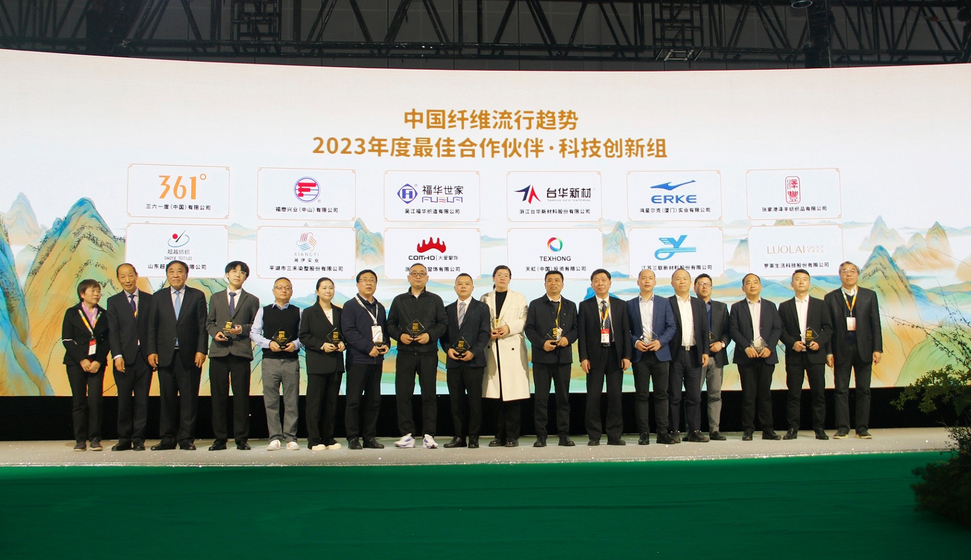 3月28日,上海國(guó)家會(huì)展中心,桐昆·中國(guó)纖維流行趨勢(shì)2023/2024發(fā)布會(huì)期間,為表彰在纖維制品創(chuàng)新開發(fā)與推廣等方面工作成績(jī)突出的下游企業(yè),特別頒發(fā)“最佳年度合作伙伴獎(jiǎng)”,共有24家企業(yè)上榜,臺(tái)華新材及福華世家獲評(píng)科技創(chuàng)新組的2023年度最佳合作伙伴。