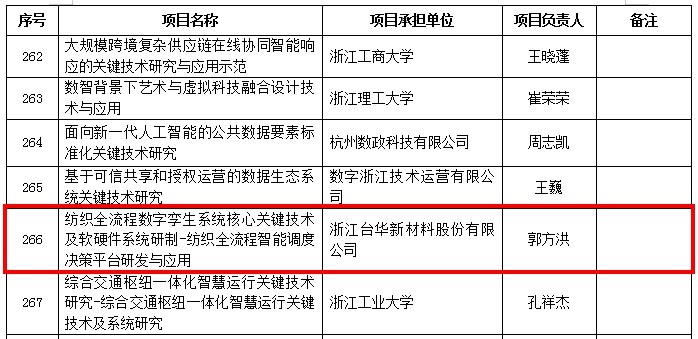 2023年12月18日,浙江省科學技術廳發(fā)布了《關于2024年度“尖兵”“領雁”研發(fā)攻關計劃項目立項的公示》,對608項擬立項的2024年度“尖兵”“領雁”研發(fā)攻關計劃項目(含省甬聯動項目)予以公示,浙江臺華新材料股份有限公司“紡織全流程數字孿生系統(tǒng)核心關鍵技術及軟硬件系統(tǒng)研制-紡織全流程智能調度決策平臺研發(fā)與應用”獲得浙江省2024年度“領雁”研發(fā)攻關計劃項目立項。