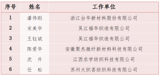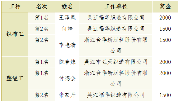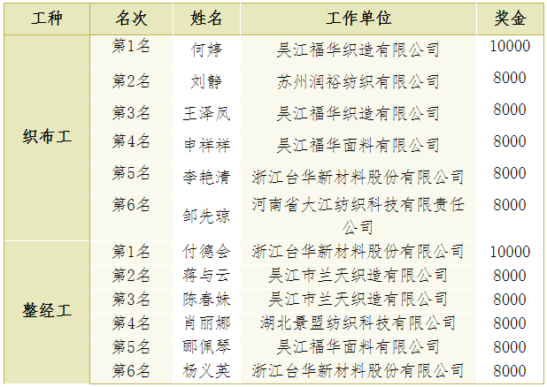 (1)織布和整經(jīng)第1-6名授予“全國(guó)紡織行業(yè)技術(shù)能手”榮譽(yù)稱號(hào),具體名單如下: