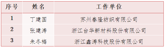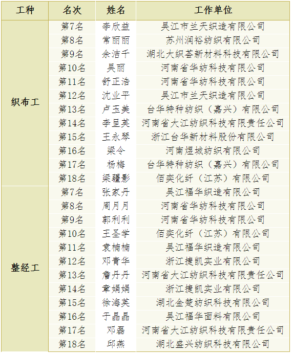 (2)織布和整經(jīng)第7-18名授予“全國(guó)長(zhǎng)絲織造行業(yè)技術(shù)能手”榮譽(yù)稱號(hào),具體名單如下: