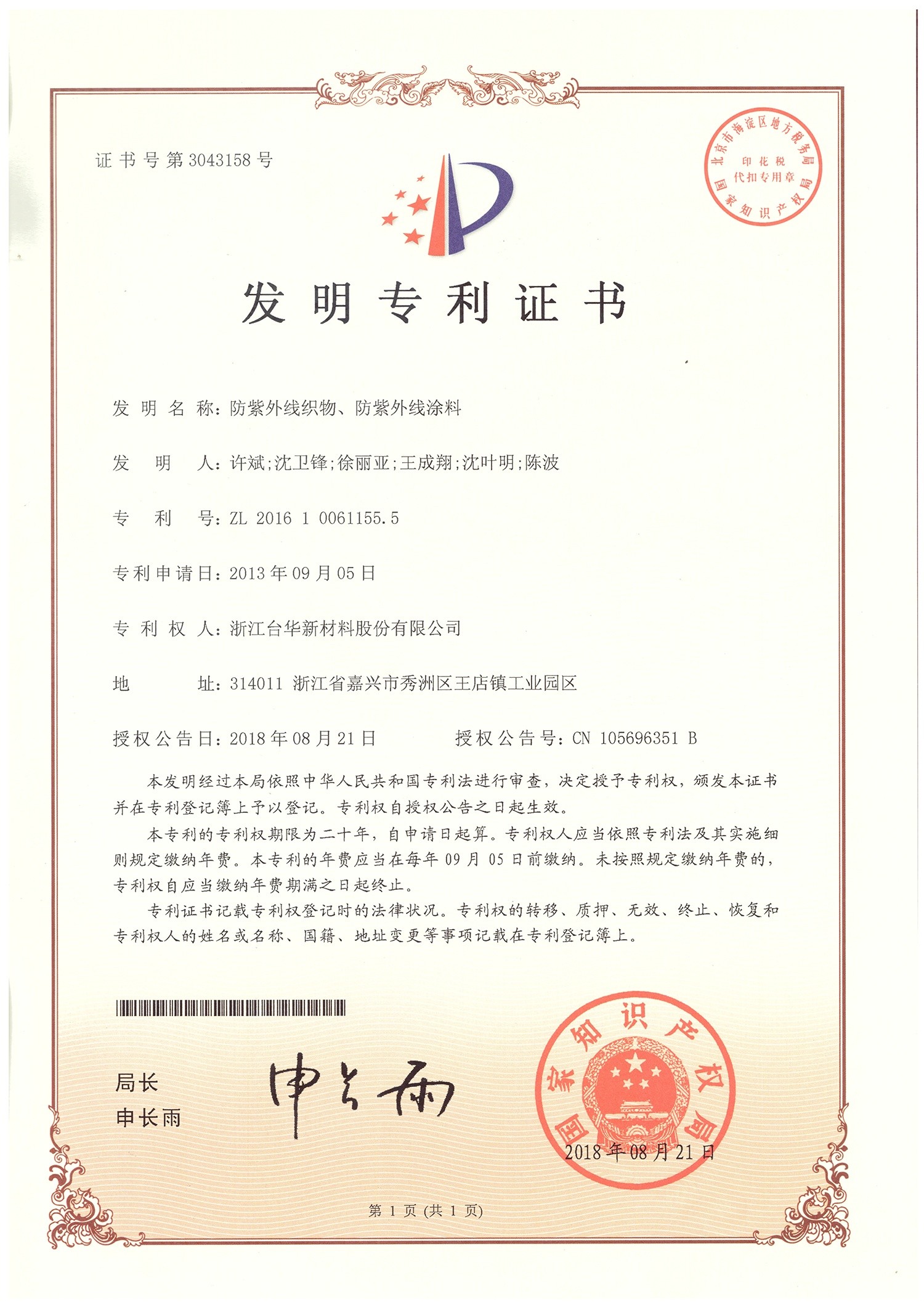 發(fā)明專利證書